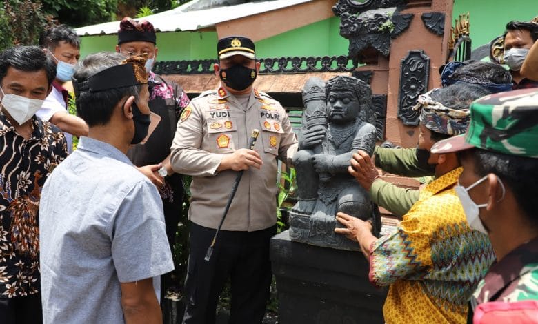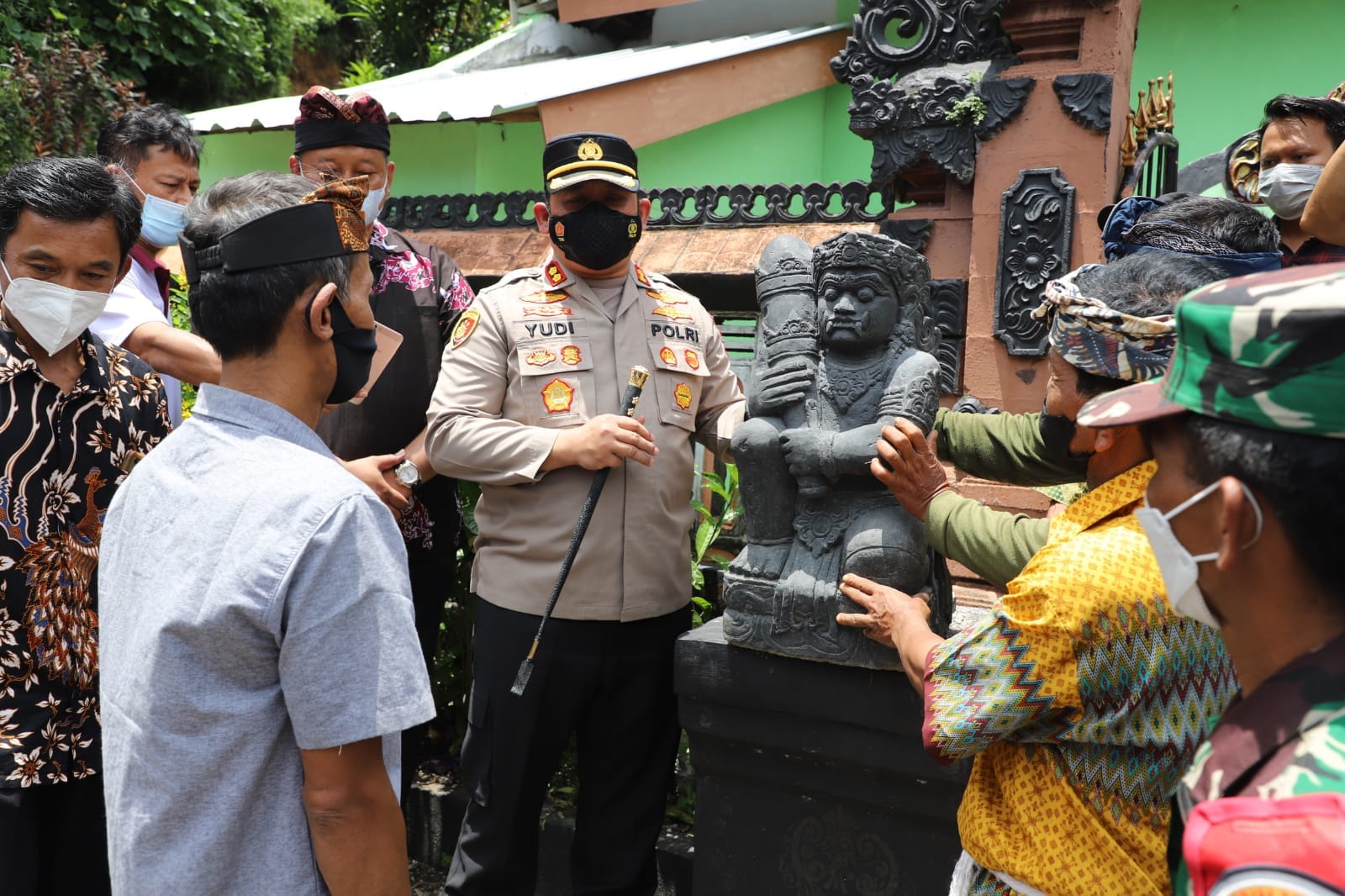 Gelar Fakta – Kapolres Kediri Kota AKBP Wahyudi. S.I.K., M.H. menyerahkan Dua Arca penganti yang rusak di Pura Joyo Amijoyo Dusun Kalinanas Desa Kalipang Kecamatan Grogol Kabupaten Kediri, Sabtu ( 19/2/2022 ).