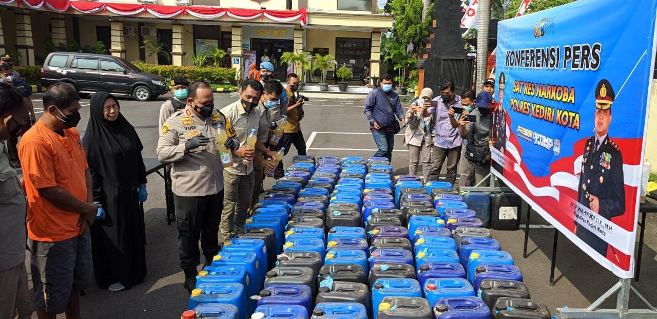 Berkat upaya yang telah dilakukan oleh Satresnarkoba Polres Kediri Kota, telah berhasil menangkap salah satu pelaku dari rangkaian proses penangkapan dari 2 pelaku sebelumnya berinisial E dan S pada Senin (18/4) lalu, di Kecamatan Banyakan Kabupaten Kediri. Dari upaya tersebut petugas berhasil mengamankan 4 jurigen dan 12 botol miras berjenis Ciu Bekonang.