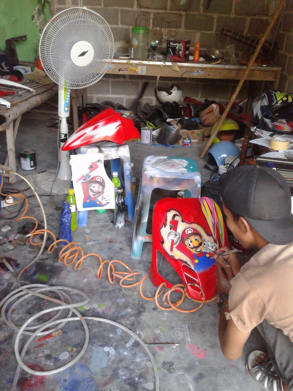 “Di tahun 2000 saya mulai belajar teknik Air Brush. Saat pertama belajar sulit. Meski saat itu saya masih duduk di bangku kelas 1 SMP saya dengan berani membuka bengkel cat. Belajar sambil usaha,” tuturnya sembari menunjukkan hasil semprotannya saat ini.