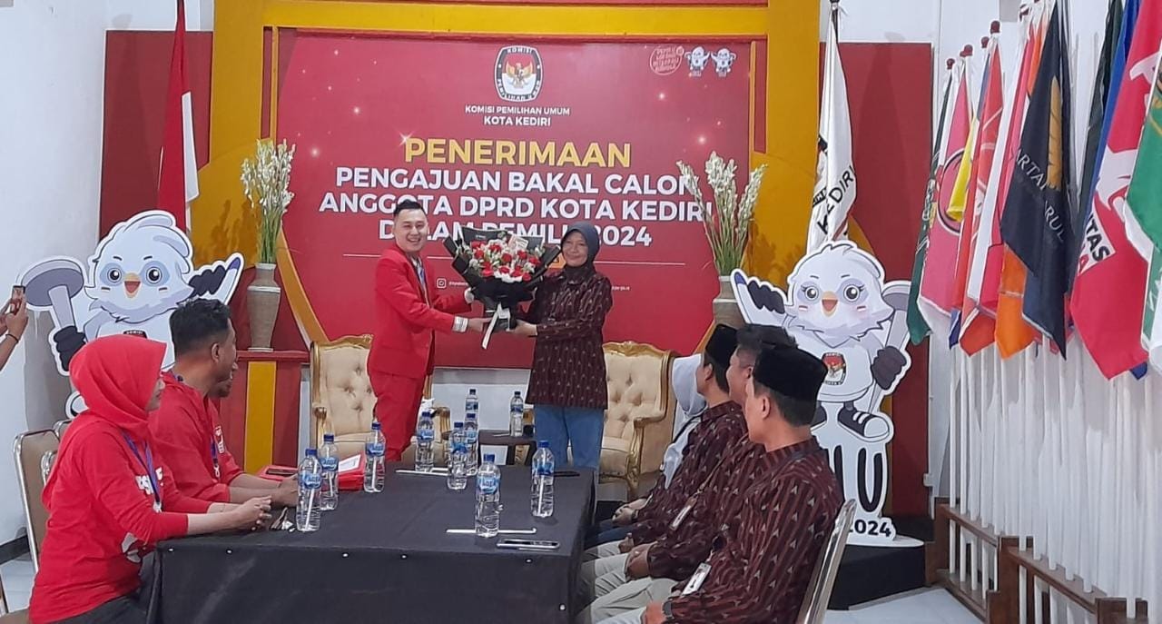 Tidak lama kemudian, berkas pendaftaran Bacaleg diserahkan oleh Ketua DPD PSI Kota Kediri Roni Siswanto kepada Ketua KPU Kota Kediri Pusporini Endah Palupi bersama komisioner.