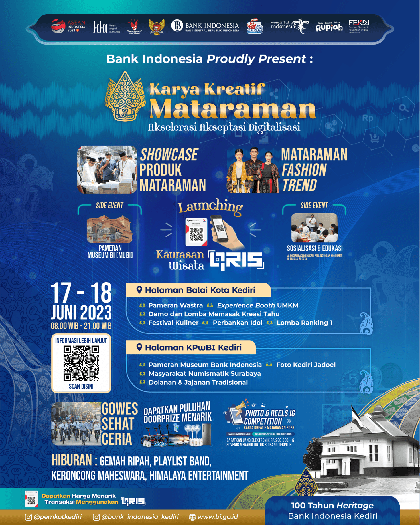 Selain itu, akan diselenggarakan berbagai kegiatan edukasi dan pameran dalam rangka Peringatan 100 Tahun Heritage Gedung Kantor Bank Indonesia Kediri (2 Juli 1923 – 2 Juli 2023) di halaman Bank Indonesia Kediri.