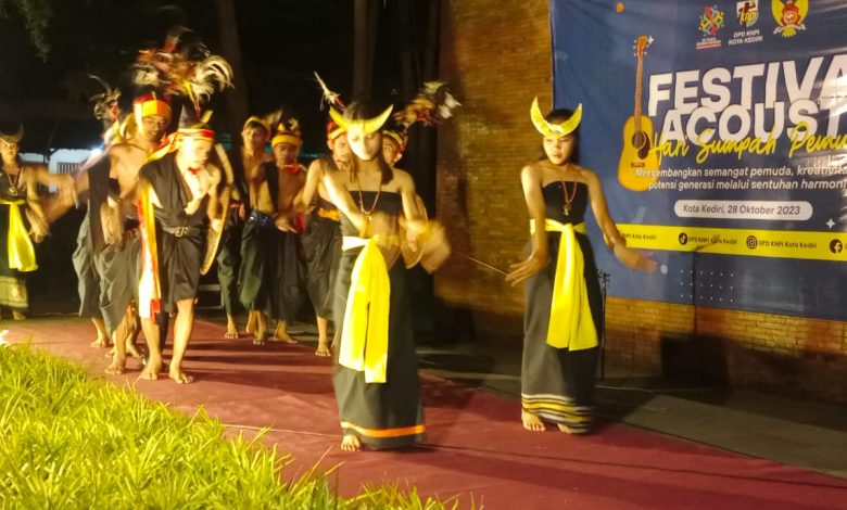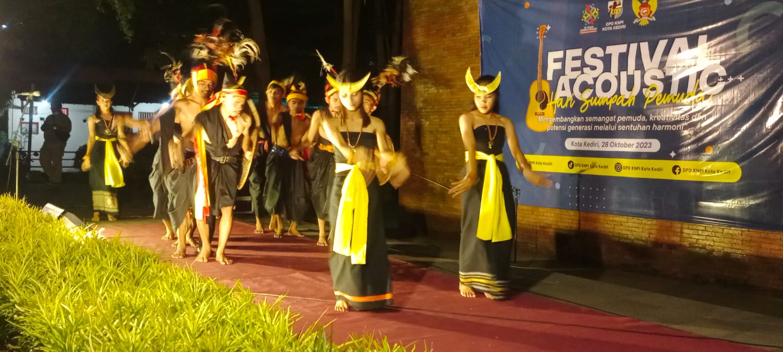 Kediri, GelarFakta – Tarian daerah Sumba Nusa tenggara Timur (NTT) yakni Kataga yang dimainkan oleh belasan mahasiswa memeriahkan peringatan Hari Sumpah Pemuda ke-95 di Kota Kediri, Sabtu (28/10) malam.