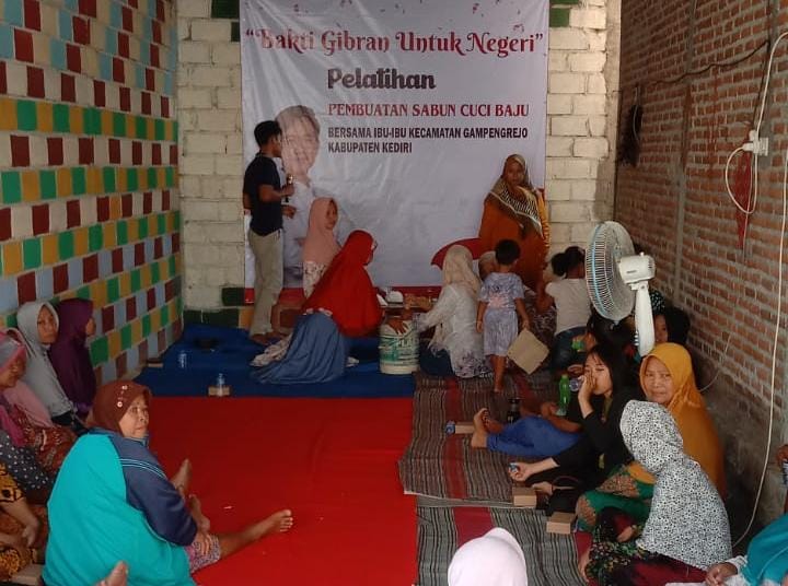 Kediri, GelarFakta – Sebagai upaya bakti Gibran Rakabuming Raka kepada negeri, puluhan emak-emak di Kecamatan Gampeng Rejo, Kabupaten Kediri, memperoleh pelatihan membuat detergen oleh relawan Bolone Mase.