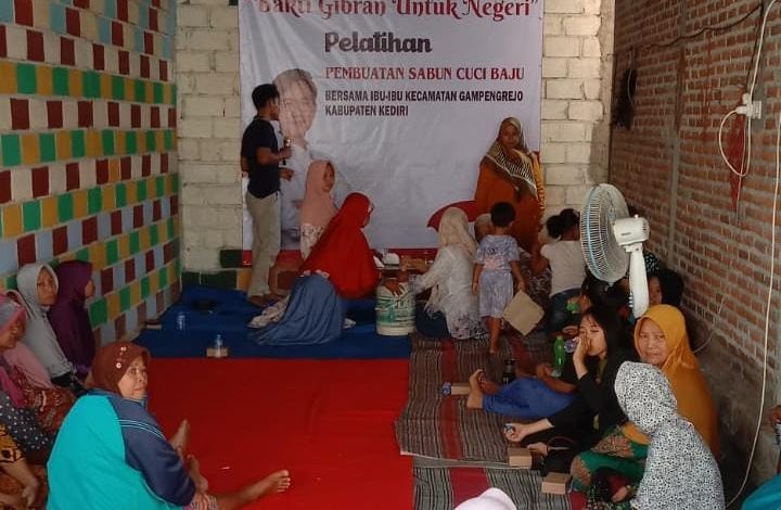Kediri, GelarFakta – Sebagai upaya bakti Gibran Rakabuming Raka kepada negeri, puluhan emak-emak di Kecamatan Gampeng Rejo, Kabupaten Kediri, memperoleh pelatihan membuat detergen oleh relawan Bolone Mase.