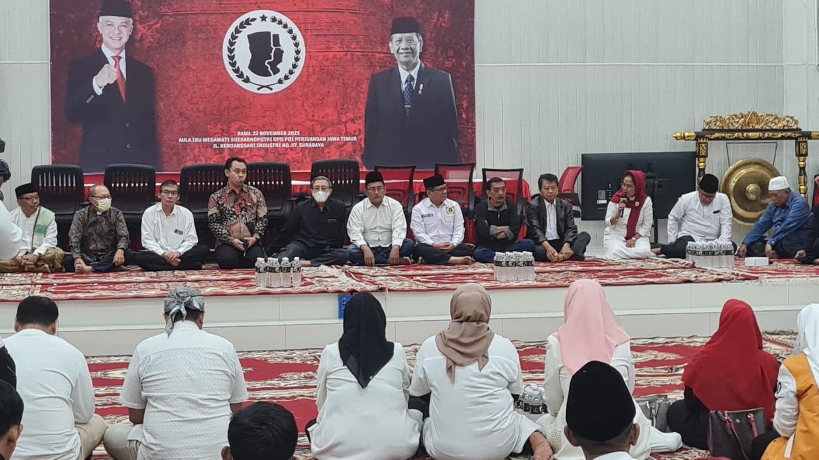 Puluhan massa yang berasal dari pengurus dan Kader Partai Pengusung dan relawan pasangan Ganjar Pranowo – Mahfud MD, tampak memenuhi aula Megawati Soekarno Putri, lantai II gedung DPD PDI Perjuangan Jatim.