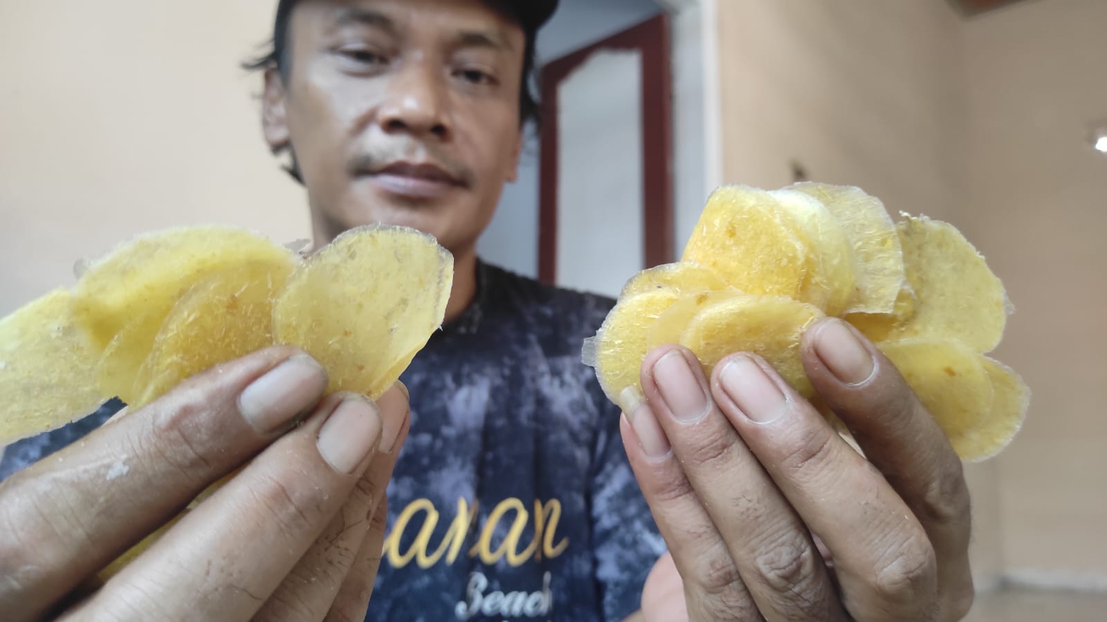 Ia memanfaatkan halaman dan dapurnya untuk menghasilkan jajanan ringan siap goreng, mulai dari emping singkong hingga getuk.
