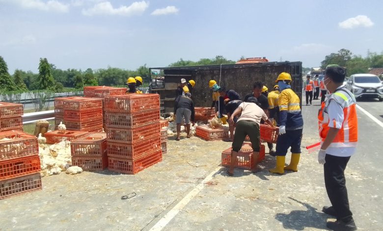 Truk Bermuatan Ayam Terguling di Tol Jombang-Mojokerto Akibat Pecah Ban