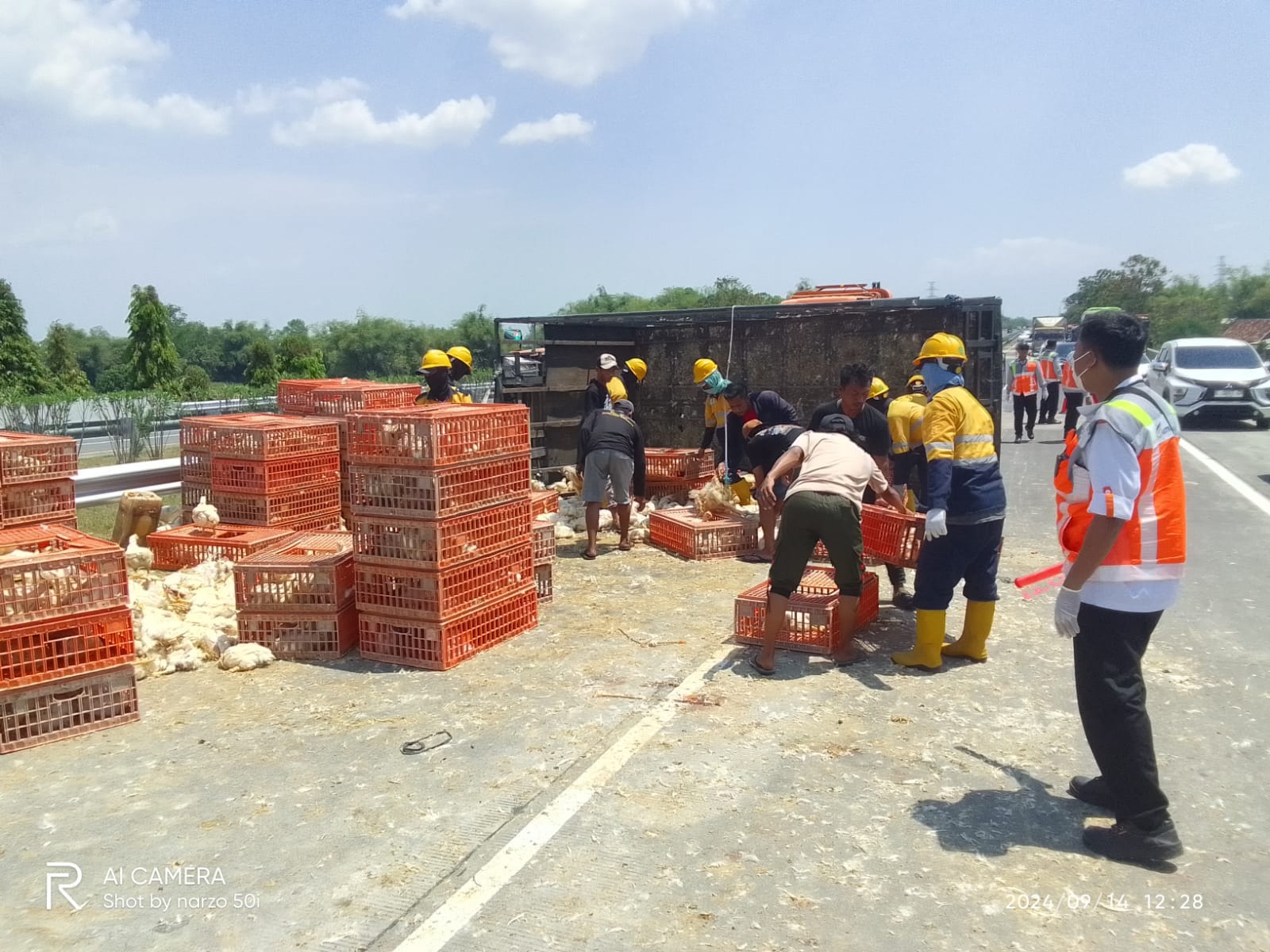 Kecelakaan ini terjadi akibat pecah ban, yang menyebabkan truk terguling dan melintang di antara lajur cepat dan lambat, serta muatan ayam berserakan di jalan.