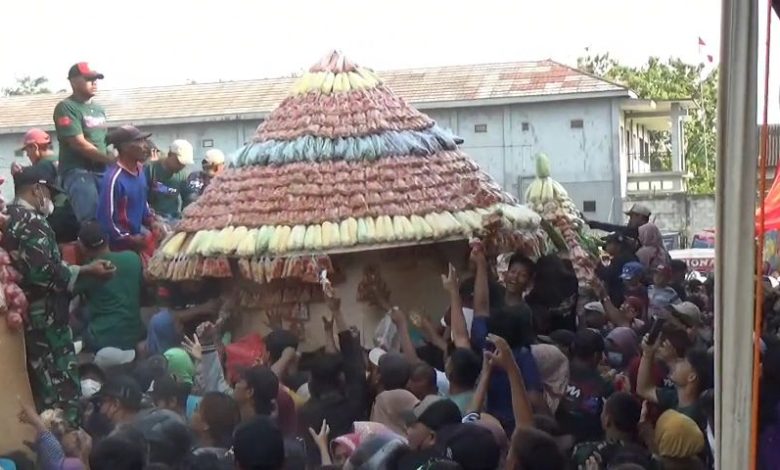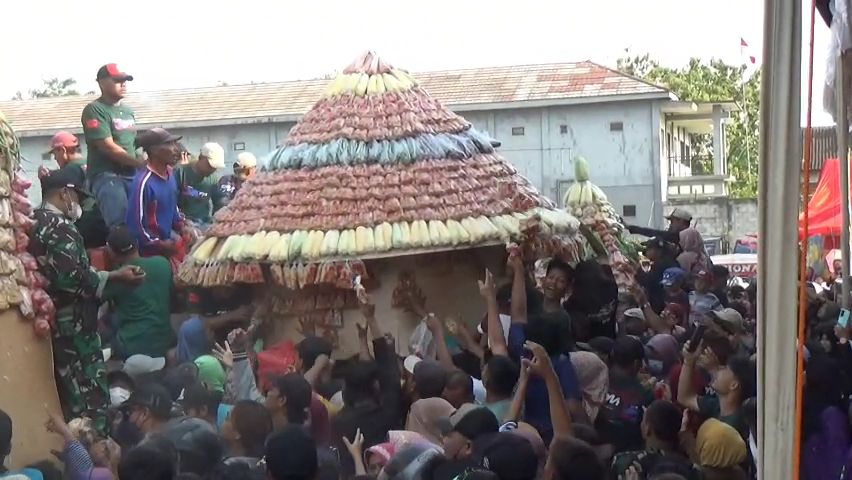 Suasana menjadi meriah saat ratusan warga langsung menyerbu gunungan tahu usai prosesi doa.