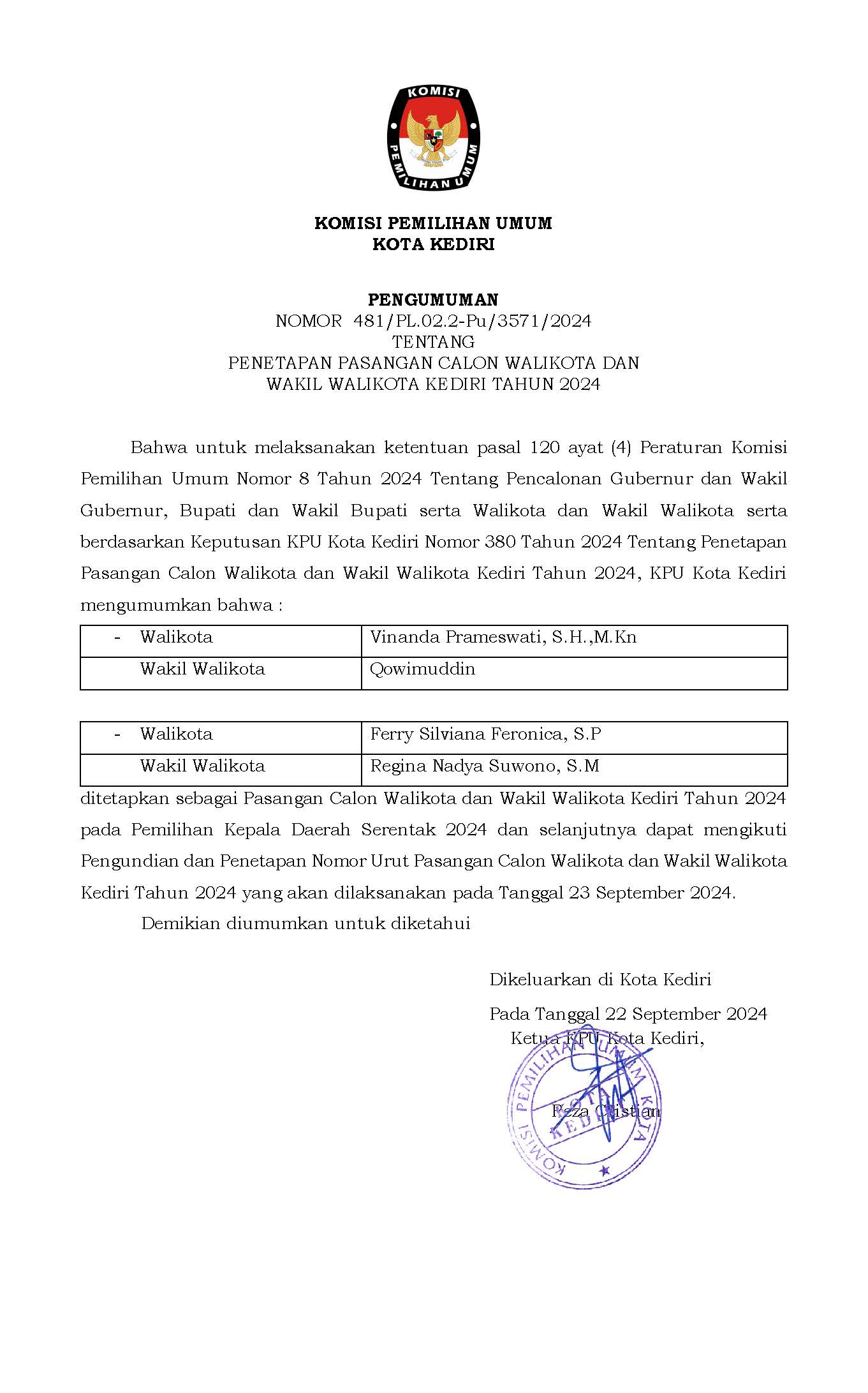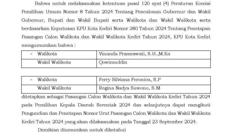 Ketua KPU Kota Kediri, Reza Cristian, mengumumkan bahwa pasangan Vinanda Prameswati – Qowimuddin dan Ferry Silviana Feronica – Regina Nadya Suwono telah ditetapkan sebagai calon resmi untuk Pilkada 2024.