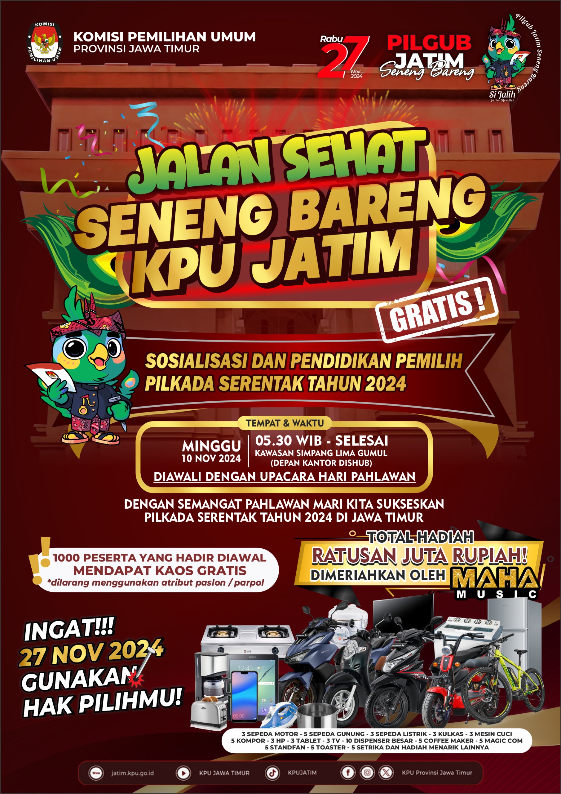 Tak hanya sekadar jalan sehat, KPU Jatim juga menyediakan berbagai hadiah menarik dengan total nilai mencapai ratusan juta rupiah.