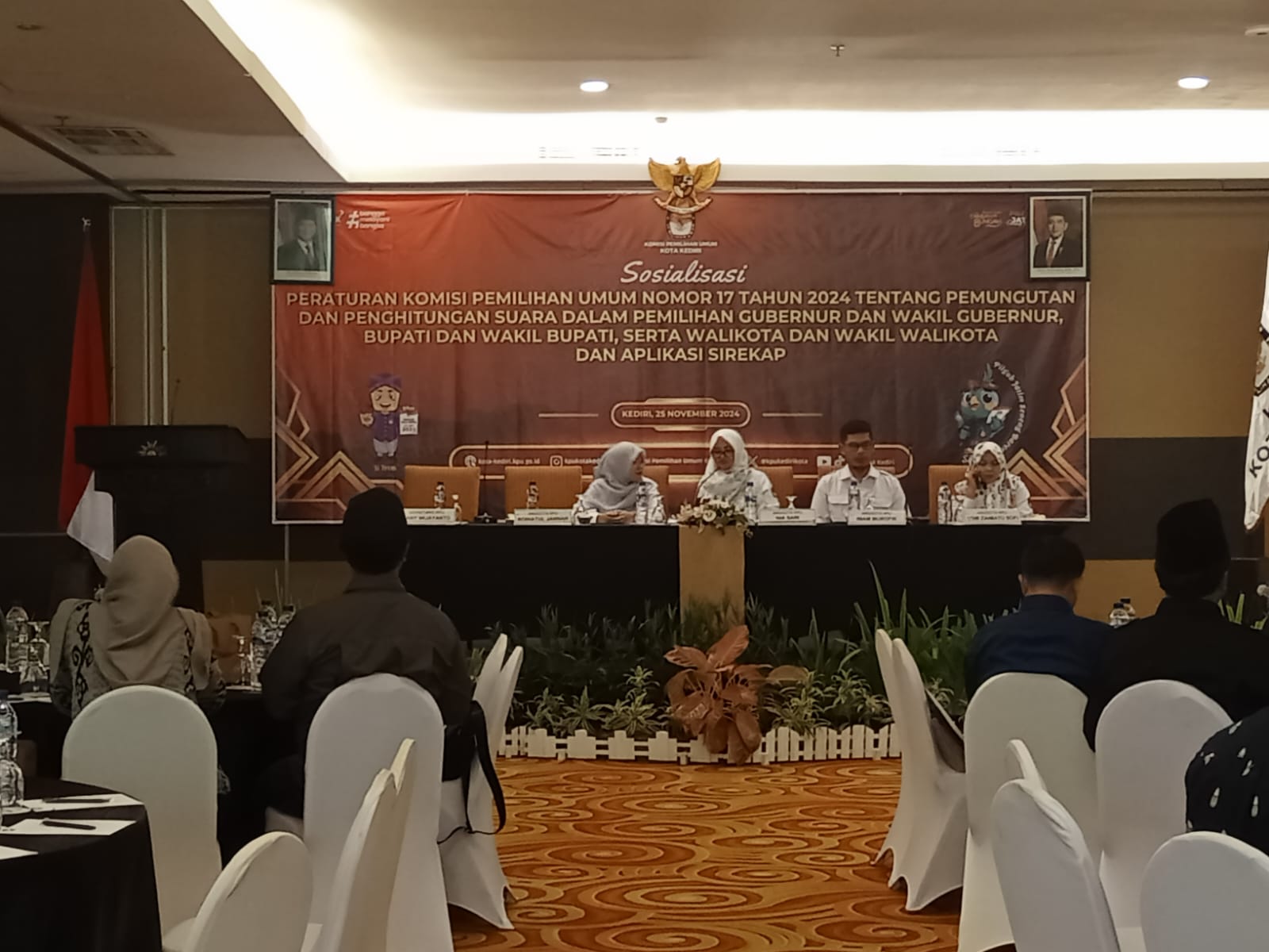 Sosialisasi ini juga membahas penggunaan Aplikasi Sirekap, yang berlangsung pada Senin (25/11) di Grand Surya Hotel, Jl. Doho, Kota Kediri.