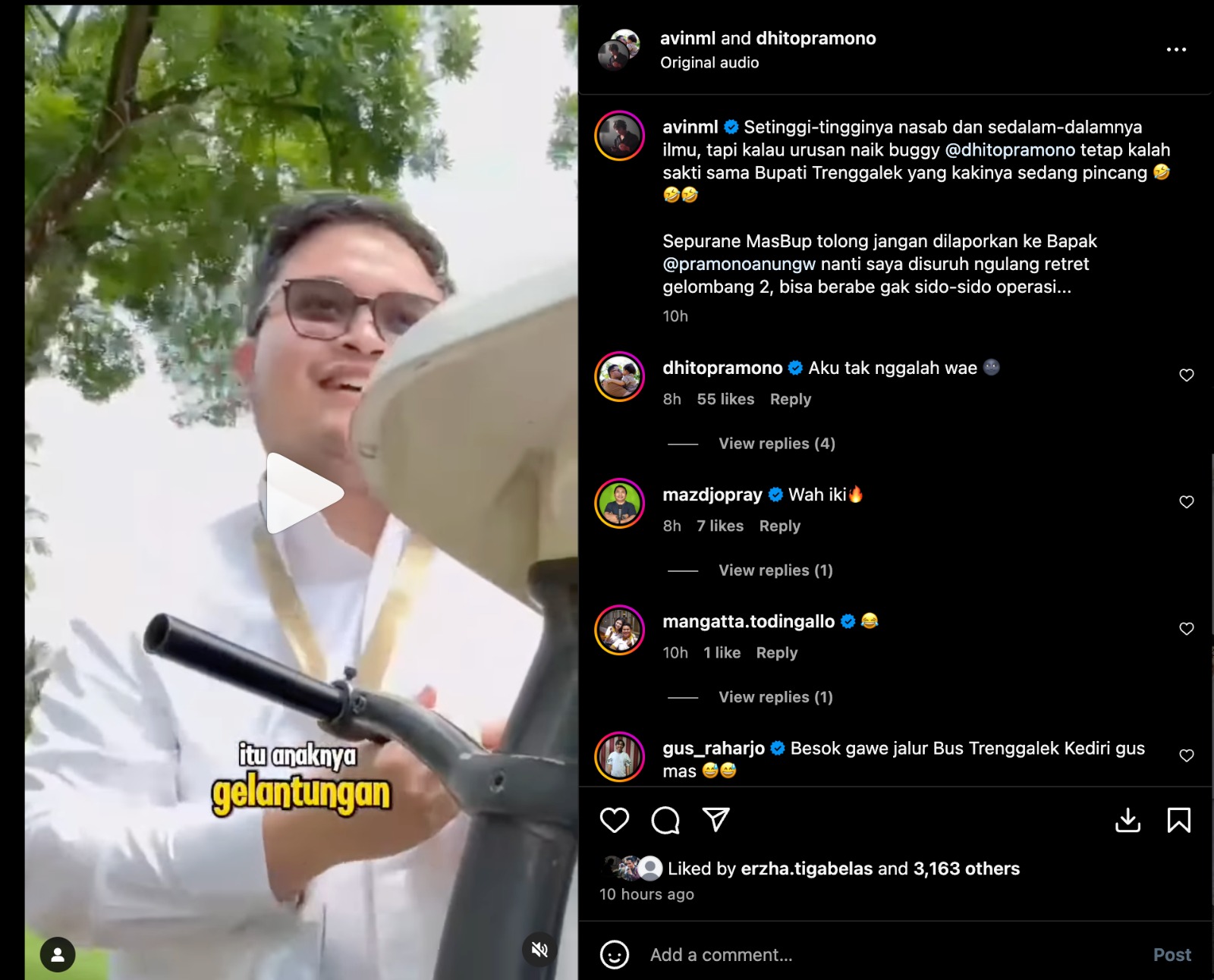Dalam video vlog yang diunggah di media sosial, Bupati Kediri yang akrab disapa Mas Dhito terlihat bersama Bupati Trenggalek Mochamad Nur Arifin atau Gus Ipin, yang mengalami cedera kaki saat menaiki buggy car.