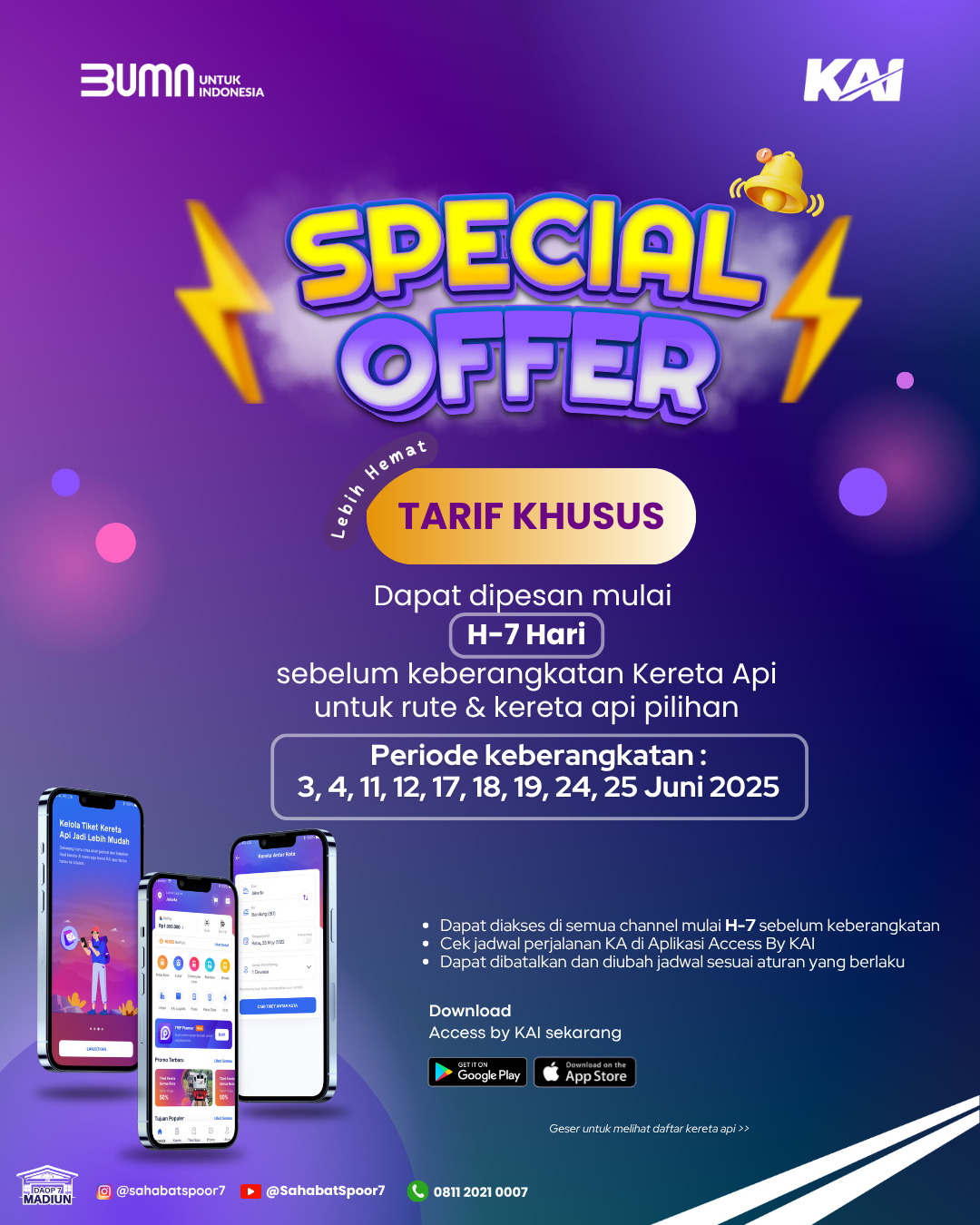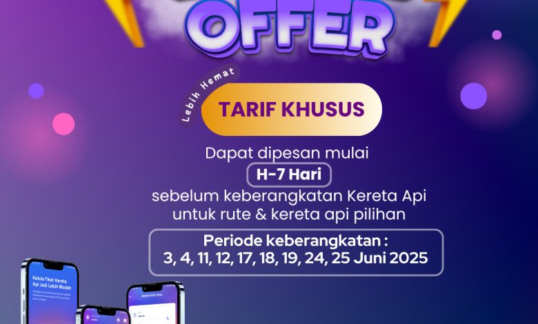 Promo tarif khusus ini dapat mulai dipesan sejak H-7 sebelum jadwal keberangkatan kereta api. Adapun periode keberangkatan yang termasuk dalam program ini meliputi tanggal 3, 4, 11, 12, 17, 18, 19, 24, dan 25 Juni 2025.