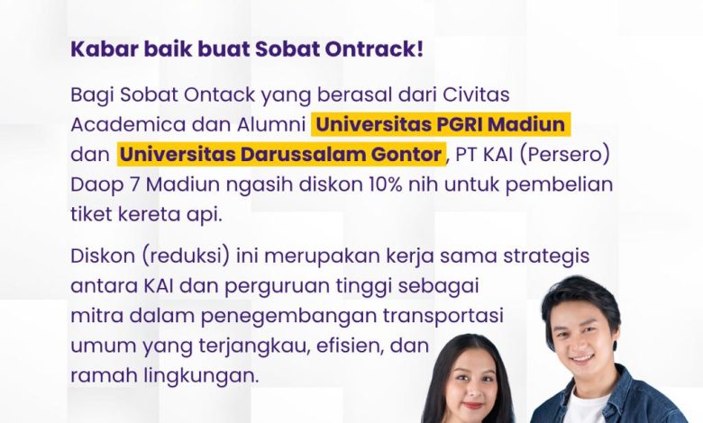 Madiun, GelarFakta — PT Kereta Api Indonesia (Persero) Daerah Operasi 7 Madiun terus memperluas jangkauan layanan dengan menghadirkan program tarif reduksi atau potongan harga tiket bagi kalangan civitas academica dan alumni dari dua perguruan tinggi di wilayahnya. Program ini merupakan bagian dari kerja sama strategis antara KAI dan institusi pendidikan untuk mendorong penggunaan transportasi publik yang efisien, terjangkau, dan ramah lingkungan.