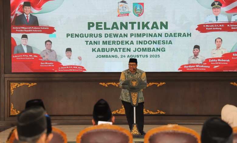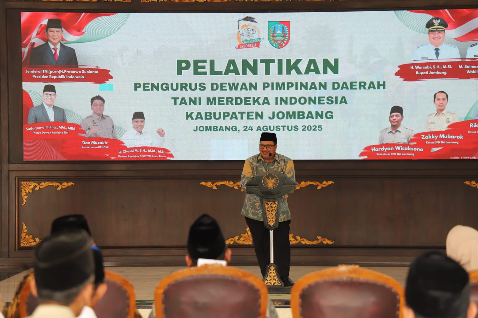 Jombang, gelarfakta.com – Organisasi Tani Merdeka Indonesia (TMI) Dewan Pimpinan Daerah (DPD) Kabupaten Jombang resmi dilantik pada Minggu (24/8/2025) di Pendopo Kabupaten Jombang. Acara tersebut dihadiri Bupati Jombang Warsubi, S.H., M.Si., Wakil Bupati Jombang Salmanuddin, S.Ag., M.Pd., Sekretaris Daerah Kabupaten Jombang Agus Purnomo, S.H., M.Si., Wakil Ketua DPRD Kabupaten Jombang yang juga Ketua DPC Partai Gerindra, Octadella Bilytha, S.T., M.B.A., Intl., kepala OPD terkait, serta pimpinan organisasi tani.