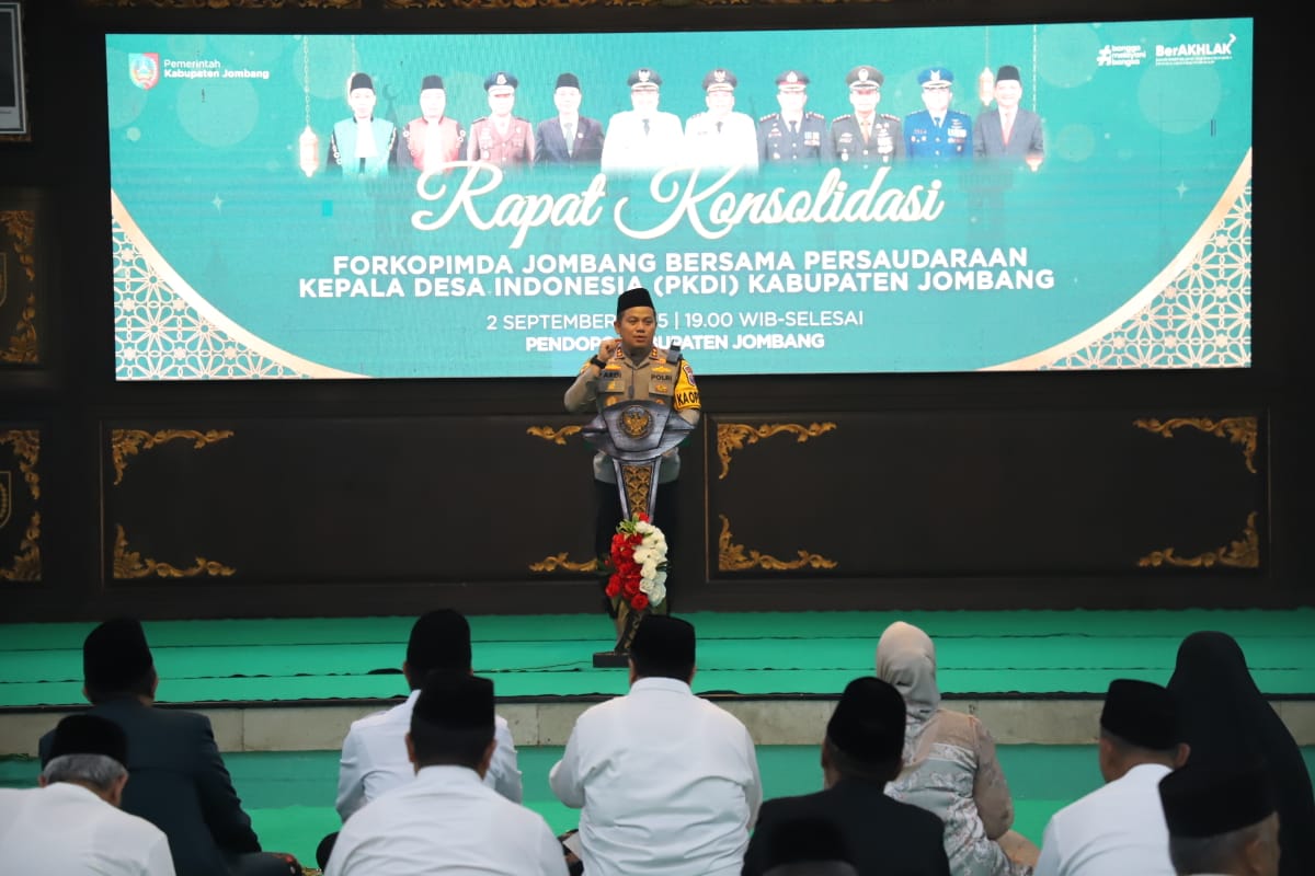 Jombang, gelarfakta.com – Menyikapi potensi gangguan keamanan di sejumlah daerah, Pemerintah Kabupaten Jombang bersama jajaran Forkopimda mengajak seluruh elemen masyarakat untuk memperkuat kerukunan dan menjaga kedamaian. Imbauan tersebut disampaikan Bupati Jombang Warsubi dan Kapolres Jombang AKBP Ardi Kurniawan dalam acara doa bersama dan rapat konsolidasi Forkopimda bersama Persatuan Kepala Desa Indonesia (PKDI) Kabupaten Jombang, Selasa (2/9/2025) malam.