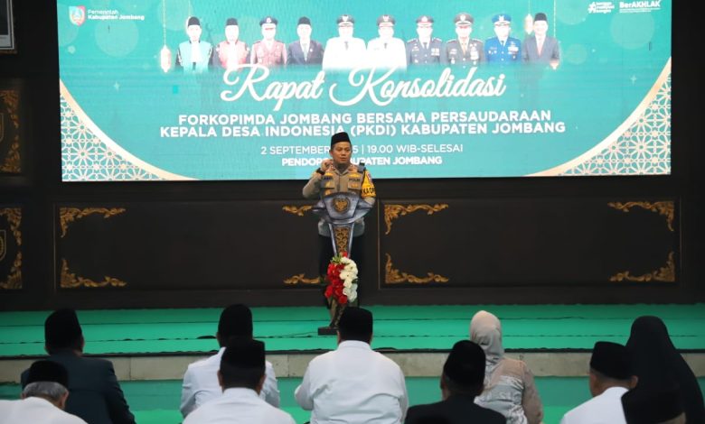 Jombang, gelarfakta.com – Menyikapi potensi gangguan keamanan di sejumlah daerah, Pemerintah Kabupaten Jombang bersama jajaran Forkopimda mengajak seluruh elemen masyarakat untuk memperkuat kerukunan dan menjaga kedamaian. Imbauan tersebut disampaikan Bupati Jombang Warsubi dan Kapolres Jombang AKBP Ardi Kurniawan dalam acara doa bersama dan rapat konsolidasi Forkopimda bersama Persatuan Kepala Desa Indonesia (PKDI) Kabupaten Jombang, Selasa (2/9/2025) malam.