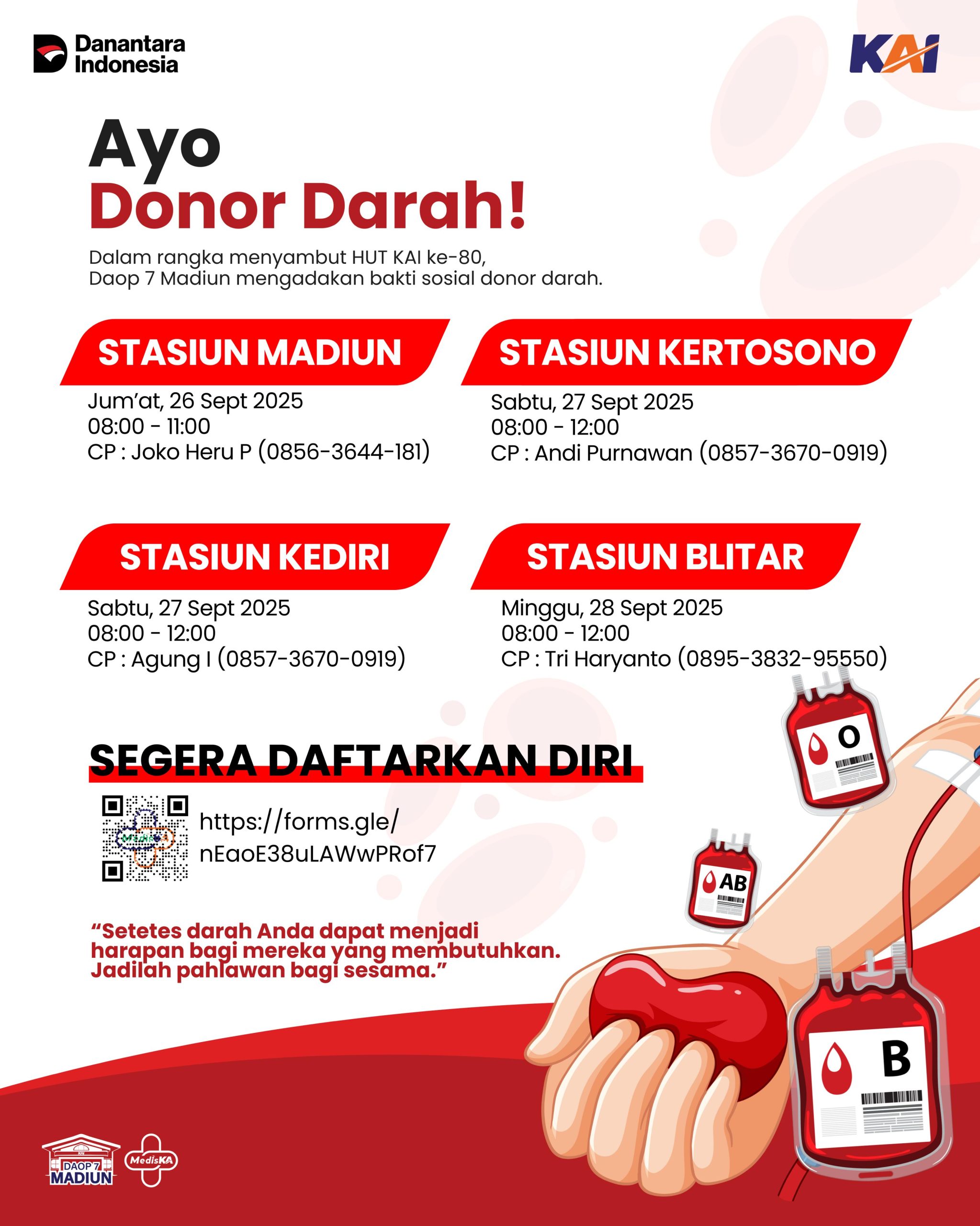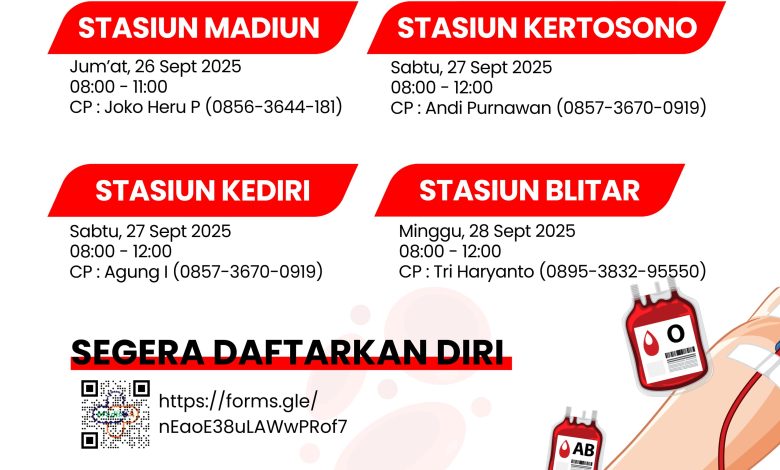 Selain di Madiun, kegiatan serupa juga akan dilaksanakan secara serentak di Stasiun Kertosono, Kediri, dan Blitar pada Sabtu (27/9/2025). Aksi donor darah ini terbuka untuk insan KAI, penumpang KA, maupun masyarakat umum yang memenuhi syarat donor.