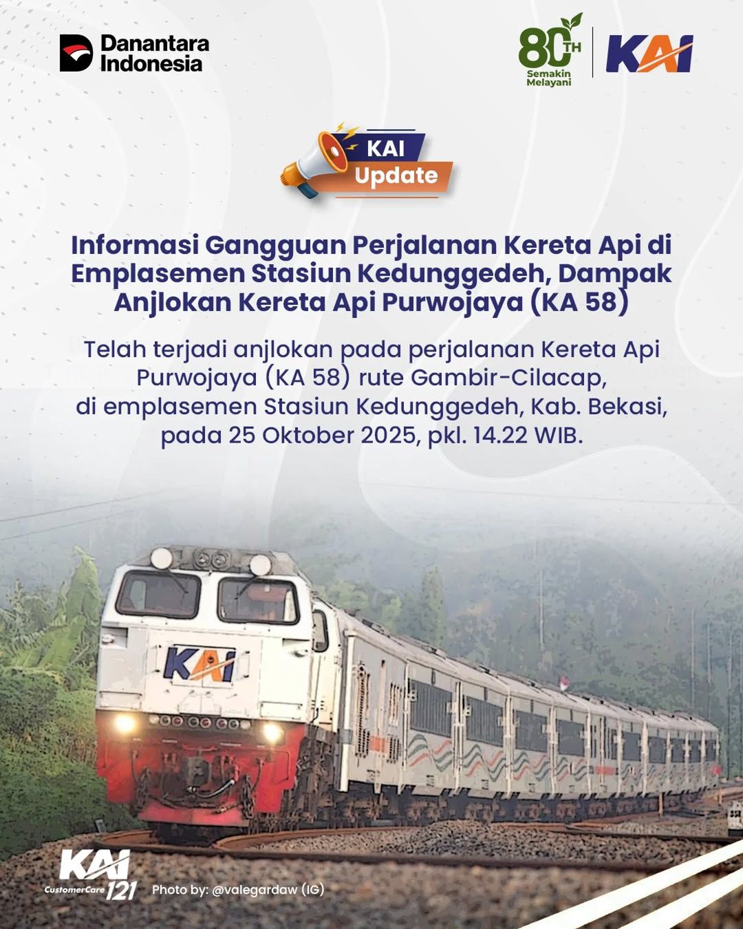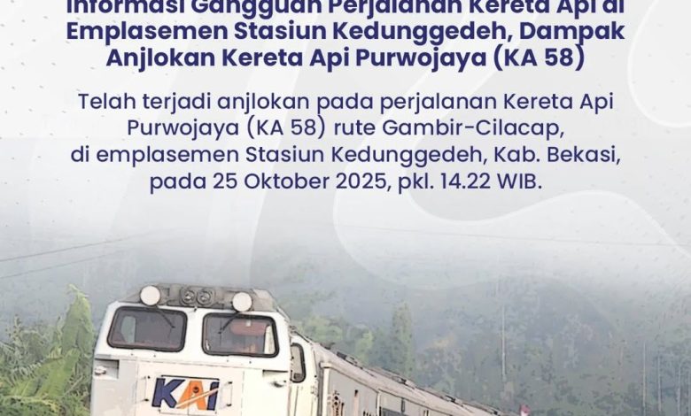 Madiun, gelarfakta.com – PT Kereta Api Indonesia (Persero) Daerah Operasi (Daop) 7 Madiun menyampaikan permohonan maaf kepada seluruh pelanggan atas keterlambatan sejumlah perjalanan kereta api yang terjadi akibat gangguan operasional pada KA Purwojaya (KA 58F) relasi Gambir–Cilacap di emplasemen Stasiun Kedunggedeh, Sabtu (25/10/2025) sore.
