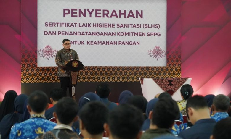 Kediri, gelarfakta.com – Bupati Kediri Hanindhito Himawan Pramana menegaskan pentingnya menjaga standar keamanan pangan di seluruh Satuan Pelayanan Pemenuhan Gizi (SPPG) yang telah beroperasi di Kabupaten Kediri. Pesan ini disampaikan dalam acara penyerahan Sertifikat Laik Higiene Sanitasi (SLHS) di Gedung Bagawanta Bhari, Selasa (28/10/2025).