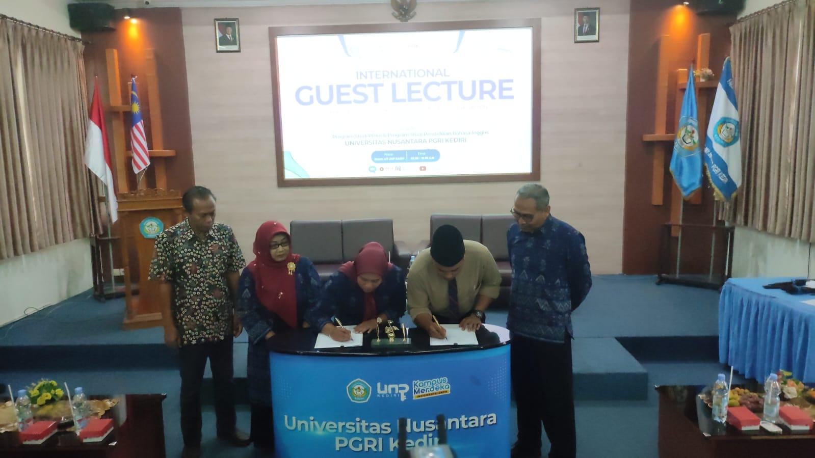Rektor UNP Kediri, Dr. Zainal Afandi, M.Pd., membuka acara sekaligus menandatangani Implementation of Agreement bersama Program Studi Pendidikan Pancasila dan Kewarganegaraan serta Pendidikan Bahasa Inggris. Penandatanganan dilakukan oleh Kaprodi PPKn, Yunita Dwi Pristiani, S.Pd., M.Sc., dan Kaprodi Pendidikan Bahasa Inggris, Dr. Khoiriyah, M.Pd. Prosesi tersebut diikuti penyerahan vandel dan sertifikat kepada Izharulhak sebagai simbol persahabatan dan penguatan jejaring lintas negara.