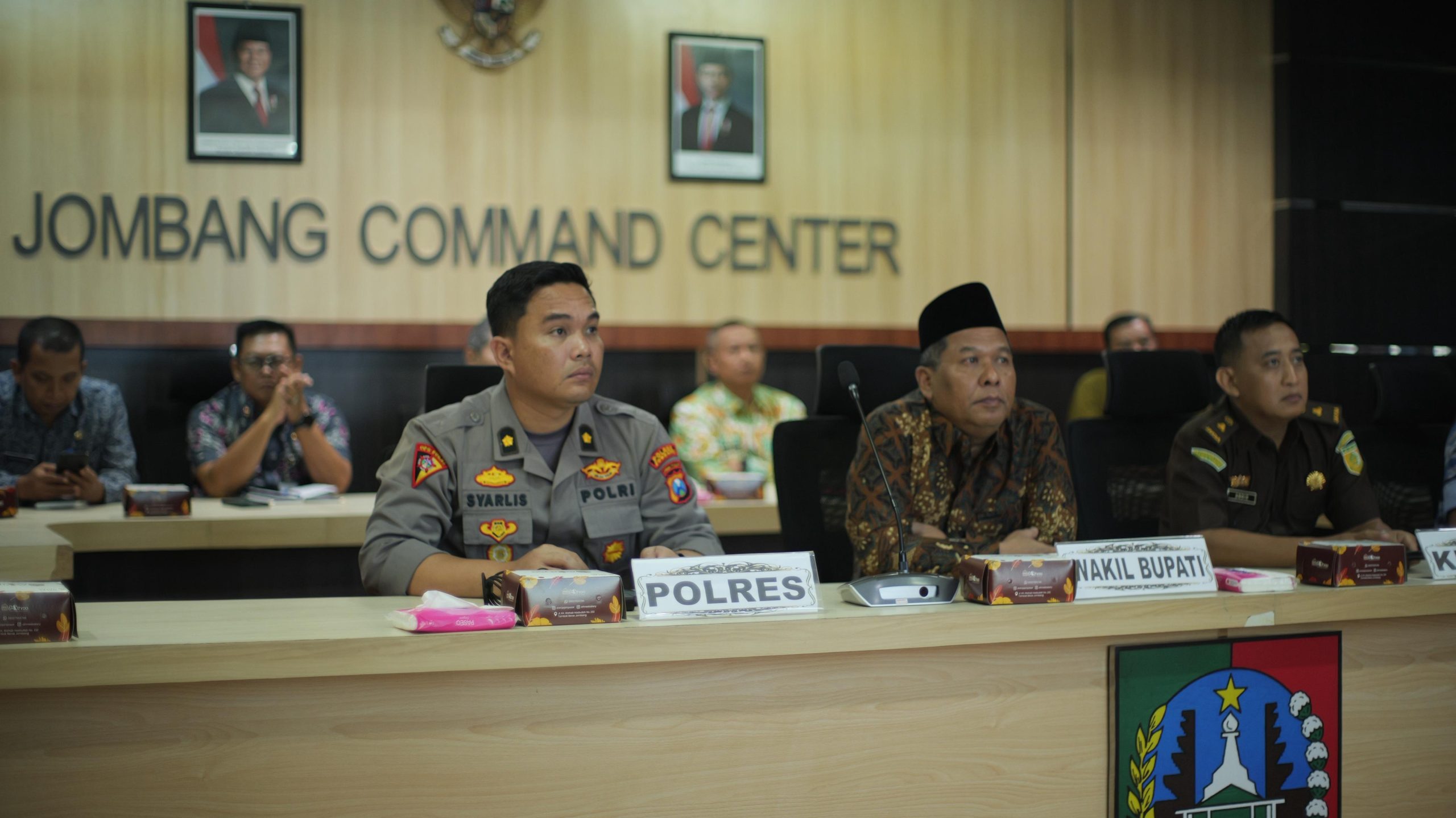 Wakil Bupati Jombang Salmanudin bersama perwakilan Forkopimda serta kepala OPD terkait mengikuti Rakornas dari ruang Jombang Command Center (JCC). Rakornas tersebut membahas langkah strategis pemerintah daerah dalam menghadapi potensi bencana, pengendalian inflasi, hingga persiapan menjelang libur Nataru.