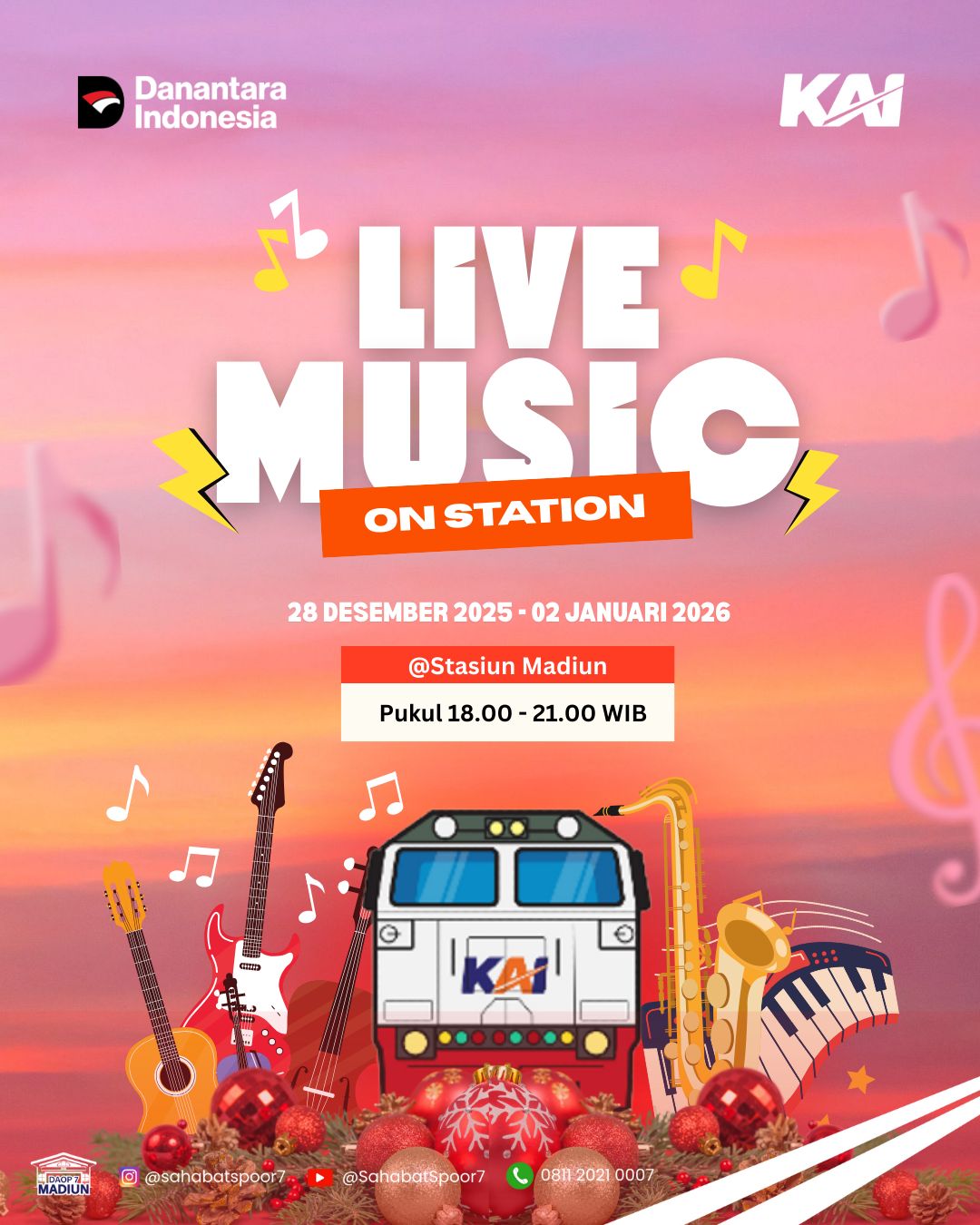 Sebagai bagian dari upaya meningkatkan pengalaman pelanggan selama masa libur akhir tahun, KAI Daop 7 Madiun menghadirkan Live Music on Station di Zona 2 Stasiun Madiun. Hiburan ini digelar mulai 28 Desember 2025 hingga 2 Januari 2026, setiap hari pukul 18.00 hingga 21.00 WIB.