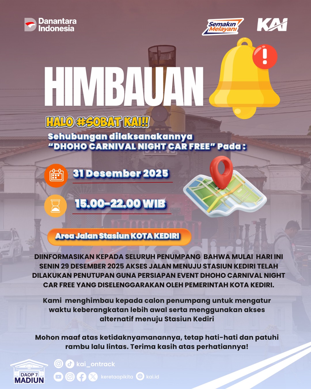 “Kami mengimbau kepada seluruh pelanggan kereta api yang akan berangkat dari Stasiun Kediri pada malam pergantian tahun agar mengatur waktu perjalanan dengan baik dan datang lebih awal ke stasiun. Hal ini penting untuk menghindari risiko tertinggal kereta akibat kemacetan lalu lintas di sekitar lokasi kegiatan masyarakat,” ujar Tohari.