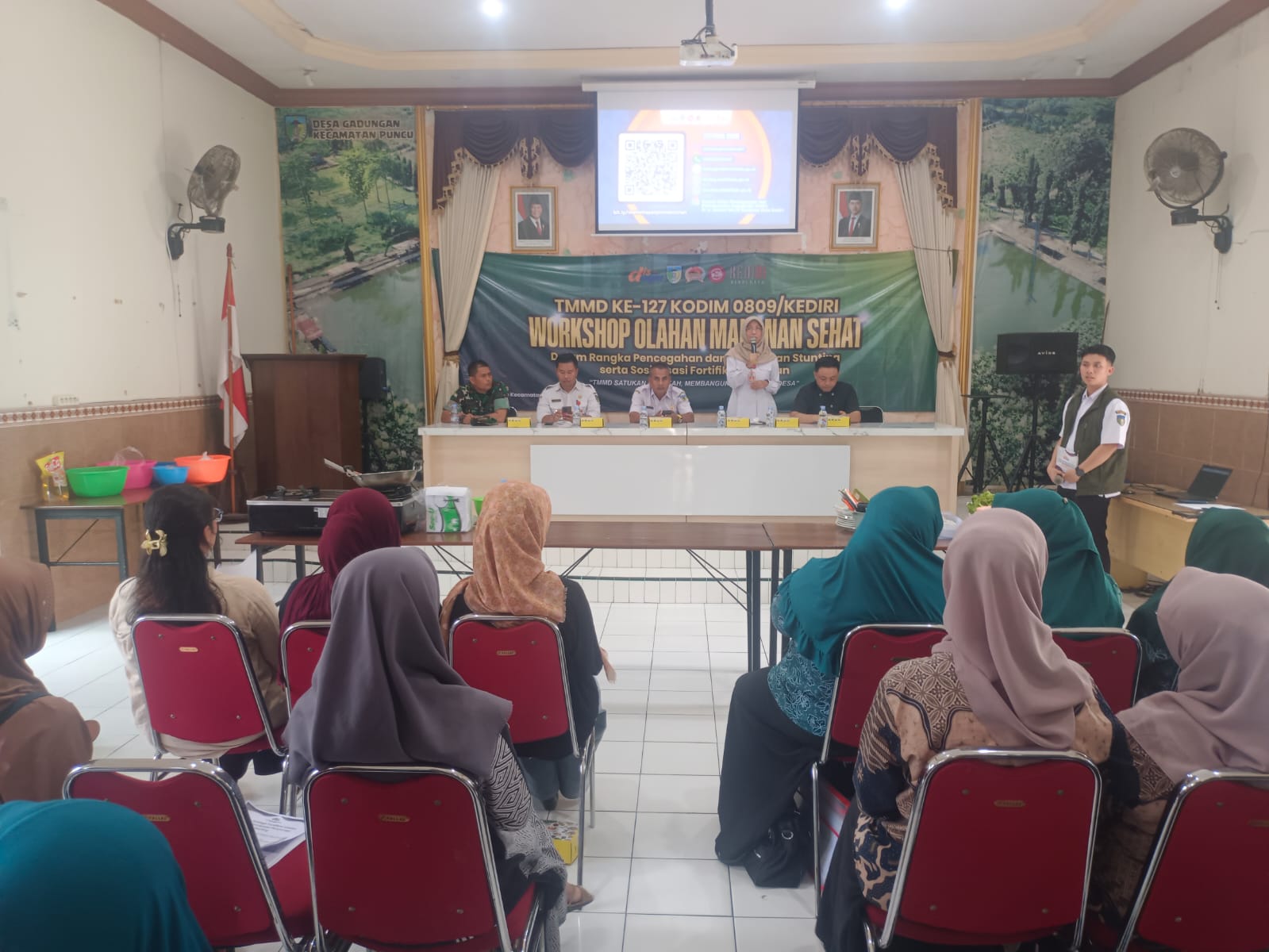 Kediri, gelarfakta.com — Dinas Perdagangan dan Perindustrian (Disdagin) Kabupaten Kediri menggelar kegiatan pengolahan makanan sehat sebagai upaya pencegahan dan penurunan angka stunting. Kegiatan tersebut dilaksanakan di Kantor Desa Gadungan, Kecamatan Puncu, Kabupaten Kediri, Rabu (11/2/2026), dalam rangka mendukung Program TNI Manunggal Membangun Desa (TMMD) ke-127 Kodim 0809/Kediri Tahun Anggaran 2026.