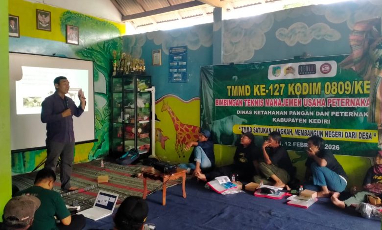 Kediri, gelarfakta.com – Pelaksanaan program TNI Manunggal Membangun Desa (TMMD) ke-127 di Kabupaten Kediri turut diarahkan pada penguatan sektor ekonomi produktif masyarakat, salah satunya melalui bidang peternakan. Hal ini diwujudkan melalui kegiatan bimbingan teknis (bimtek) peternakan kambing yang digelar di Balai Dusun Jatirejo, Desa Gadungan, Kecamatan Puncu, Kamis (12/2/2026).